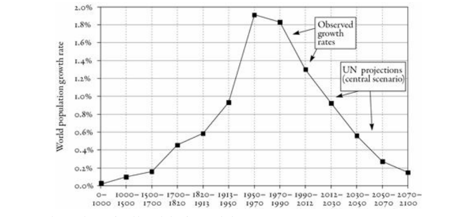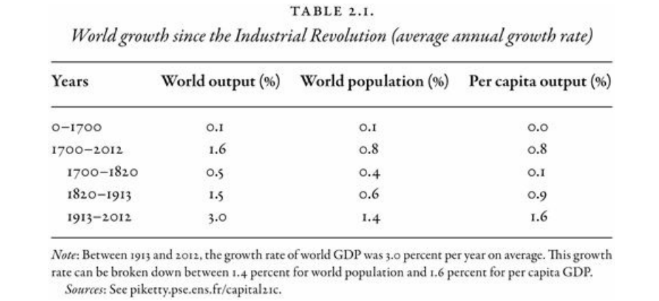 World population growth is rapidly declining. Piketty cites UN projections (seen above) that show we’ve already fallen to about half of the average rate of population growth in the 20th Century and that we’re heading for a state of no growth by the later part of the 21st century.