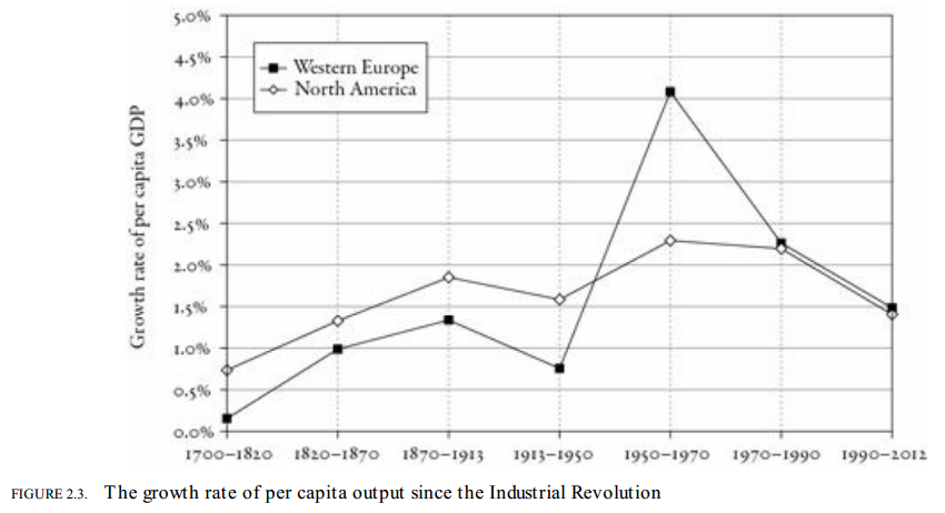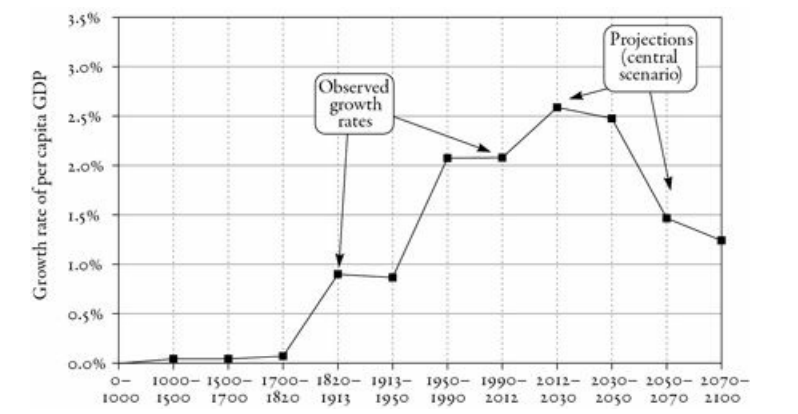 It turns out that growth in per capita output is falling as well. In Western Europe and North America, productivity growth reached a peak in about 1970 and has been in decline ever since.