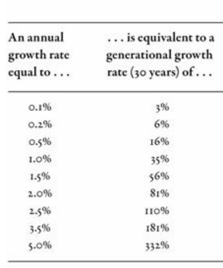 What does 3% of economic growth per year mean in human terms? How much change is that? Piketty translates the compound growth rate into a convenient generational figure: